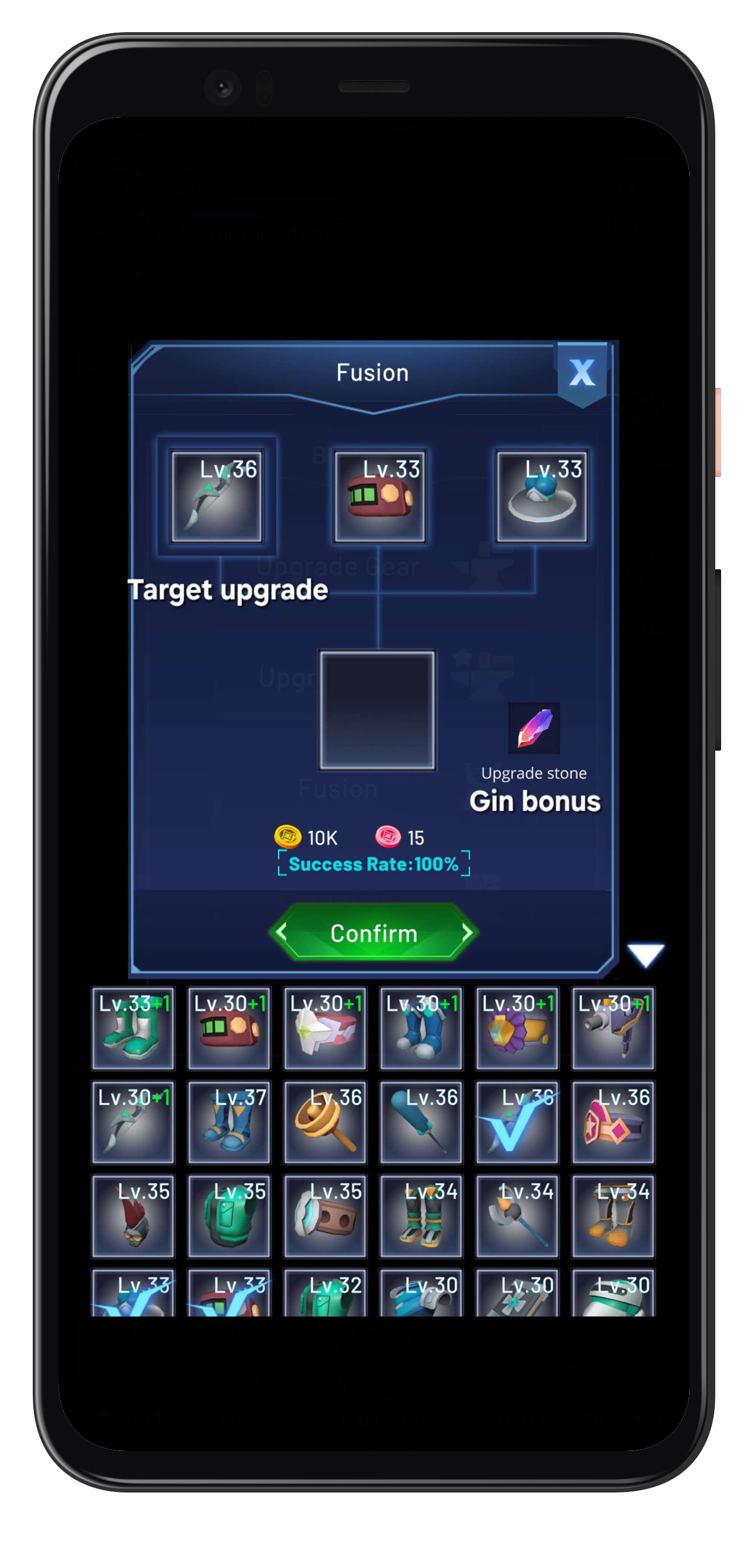 * Level of item or stats have no effect on outcome of gear being fused. You can use two level 1 gears to upgrade a level 50 rarity for same results.